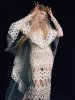 Sheer tulle gown, $8,500, iridescent pearl-embellished belt, and armbands, all by Honor. Tulle and pearl head cage, $1,700, by Honor. Sterling silver Italian Boy Key Earring by Donna Distefano. Silver mirror Aurora 90 mules by Malone Souliers.